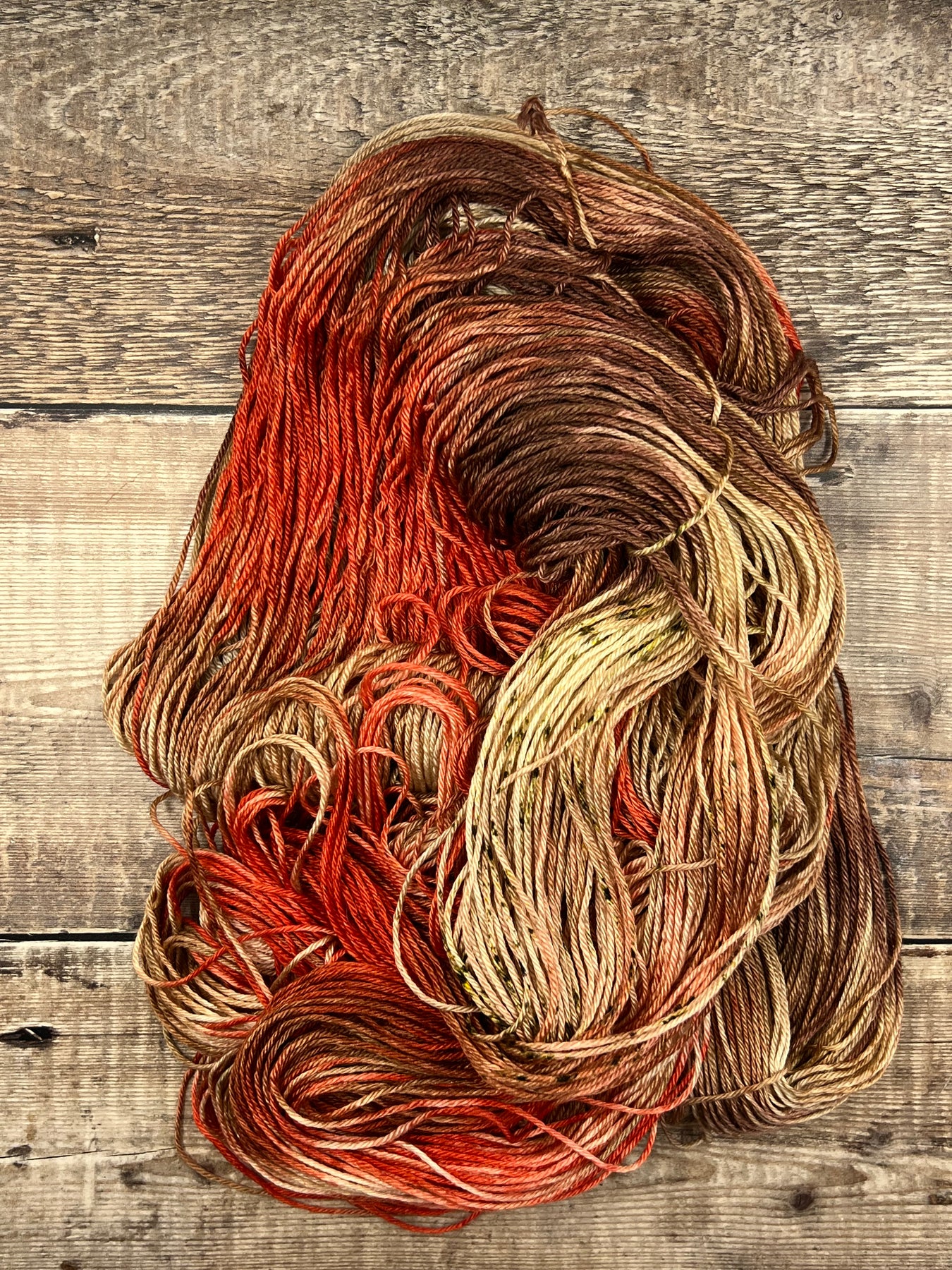 A rich, earthy palette of deep brown, red, taupe, with a sprinkle of moss green, inspired by the forest floor in autumn. Mushroom Season captures the quiet beauty of woodland walks during autumn. Its variegated hues mimic the natural palette found in wild mushrooms and fallen leaves, creating a yarn that feels both grounded and enchanting.