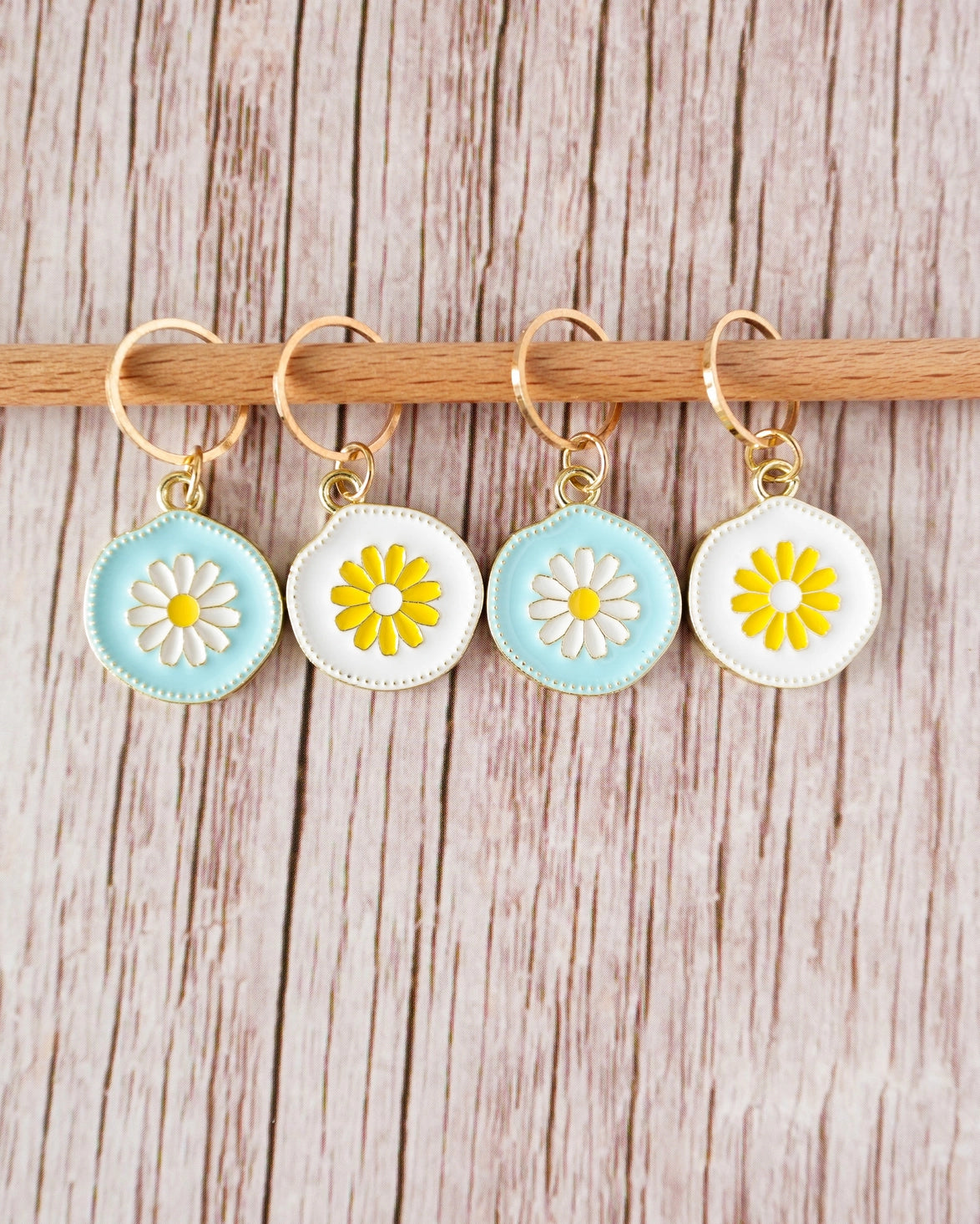 Set of 4 enamelled stitch markers. The Daisies set consists of 4 marker rings that add a floral and spring touch to your work.